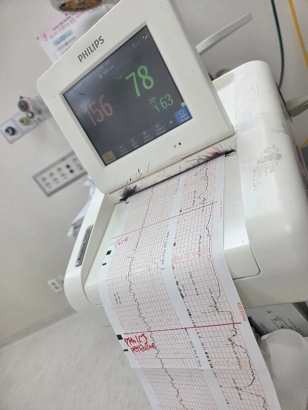 분만 중에는 모니터링 장비를 통해 자궁 수축과 태아 상태에 대한 실시간 정보를 얻는다. (이미지 출처 = 본인)